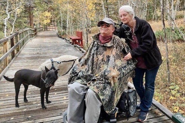 Robin Bouldoc and her husband Bruce Goguen love to go for hikes in and around their home in Colorado. That might - at first glance - seem unusual. After all, Bruce suffers from primary, progressive multiple sclerosis (MS), a degenerative illness. He requires a power wheelchair equipped with a respirator and a device that allows him to control the chair using head movements.